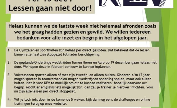 Beste Leden, ouders en verzorgers. Het afgelopen jaar hebben wij allemaal, in meer of mindere mate, te maken gekregen met het Corona virus. Voor de leden van de KEV betekende dit onder andere geen deelname aan wedstrijden. En nog vervelender voor de leden dat ze niet of minder hebben kunnen sporten. Hierbij willen wij nogmaals onze dank uitspreken naar alle leiding die door hun geweldige inzet de lessen voor de zomer buiten hebben georganiseerd. Door hun kwam het niet tot een algehele stop, hulde! Omdat ook nu nog niet alle lessen volledig kunnen worden gegeven hebben wij besloten om de contributie voor de maand december 2020 niet te incasseren. Op deze manier willen wij onze leden een beetje tegemoet komen in deze bijzondere tijden en in de dure decembermaand. We wensen iedereen fijne feestdagen en een bijzonder gezond en sportief 2021 toe. Bestuur KEV