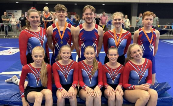 Afgelopen weekend vond het grootste Nederlands Kampioenschap van de gymsport plaats: ‘Dutch Gymnastics The Finals’. In de vele hallen van Ahoy Rotterdam schitterde de top van Nederland in verschillende disciplines. KEV Vriezenveen was op zaterdag met van de partij op het NK individueel springen. Na de plaatsingswedstrijd in mei werd KEV met maar liefst 44 plekken vertegenwoordigd op het NK. En met succes! Er werden 5 gouden, één zilveren en één bronzen medaille mee naar huis genomen. De dag startte voor KEV met Menoa Zwiers, Merle Staal, Teun Bekke (junior B), Juliëtte Bom, Sterre Verhulst (junior A), Mees Bekke, Desiree Wanschers, Tessa Dekkers, Britt Rouweler, Seline Oudelaar en Annelot Bolk (senior A). In een sterk deelnemersveld lieten de springers hun beste sprongen zien. Teun Bekke mocht hiervoor een gouden medaille in ontvangst nemen op het onderdeel minitrampoline. Desiree Wanschers behaalde op al haar toestellen een medaille en ging naar huis met twee gouden (pegasus en airtrack) en één zilveren medaille (minitrampoline). Een topprestatie! In de middag was het de beurt aan Emma Nuis, Jitske van de Vegte, Nicole Lemans, Lian Dasselaar (junior A), Sanne Grol (senior C), Bob Dekker (junior C) en in het allerhoogste niveau Daan Scherphof en Tim Wolthuis (senior A-ere). Ook zij lieten hun beste sprongen zien waarbij Sanne Grol en Bob Dekker een gouden medaille hebben verdiend op het onderdeel minitrampoline. Tim Wolthuis ging naar huis met een bronzen medaille voor het onderdeel pegasus. Het trainersteam, bestaande uit Marleen Haandrikman, Laurien Verheijen, Iris Exel, Sanne Grol en Eline van Dijk, is ontzettend trots op alle springers. Het springseizoen is op deze manier met veel succes afgesloten. Op naar een nieuw seizoen met weer vele wedstrijden!