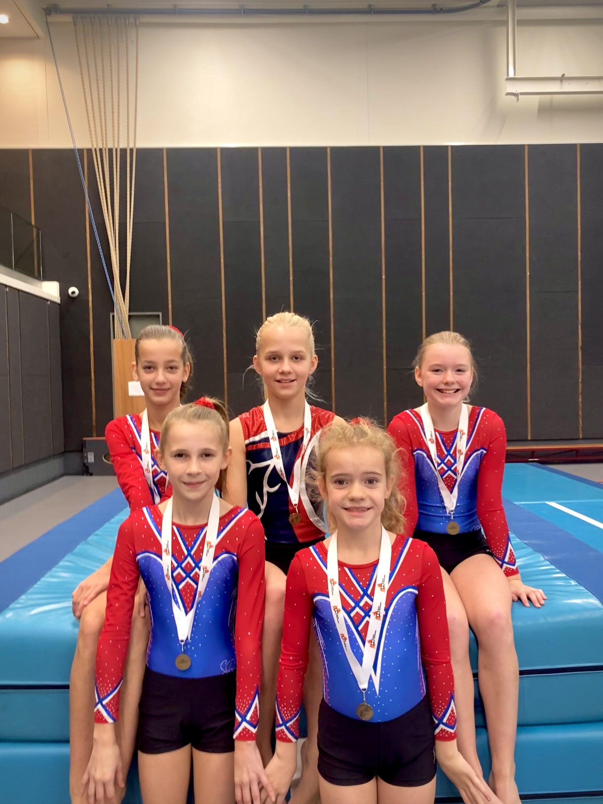 In de ochtend begon het 1e team. Dit team bestaat uit: Aveline, Eva, Imke, Nina en Noa. De meiden hadden er erg veel zin in. Ze begonnen met het toestel vloer. Er zijn mooie oefeningen geturnd. Daarna kwam sprong, een toestel waar de meiden erg sterk op zijn. Dat was ook wel te zien in de score. Aveline en Noa waren zelfs op dit toestel 1e. Vervolgens gingen ze naar brug. Ze lieten mooie oefeningen zien en zijn trots op de scores. Als laatste toestel kwam balk. Een spannend toestel. De oefeningen gingen goed en de meiden zijn tevreden met de punten. Nina werd 1e op dit toestel. In totaal zijn de meiden 4e geworden. Een super knappe prestatie.