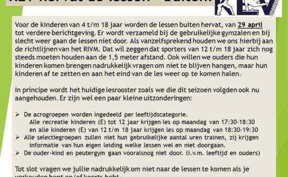Vanaf 9 mei kreeg de gymnastiekvereniging het ‘groene licht’ van de gemeente. Yes, K.E.V. mag buiten sporten met al haar leden tot 18 jaar. Na de goedkeuring van het “Plan Van Aanpak” is K.E.V. op 11 mei enthousiast van start gegaan, zelfs aan het eind van de week mocht ook de 18+ opstarten en is de vereniging weer volop aan het draaien. Om grote drukte te voorkomen traint de vereniging op 4 verschillende locaties die door de gemeente zijn toegekend. Uiteraard volgt de vereniging alle richtlijnen van het RIVM. Voor alle trainers is het even zoeken naar de mogelijkheden buiten de zaal en dat vraagt veel creativiteit van de leiding van K.E.V.. Gelukkig weten ze daar wel raad mee en is de eerste week erg goed verlopen. Er is volop getraind op bewegingsvormen, kracht, lenigheid, dans, behendigheid en conditie. Maar wat wel het belangrijkste was, was het weerzien en de gezelligheid, wat nog meer bewijst dat K.E.V. meer is dan sporten alleen! De komende weken zullen de lessen verder uitgebouwd worden en zal de leiding nog meer gaan inspelen op de mogelijkheden van de ruimte buiten op de verschillende aangewezen locaties. Ook al is dat zonder de vele toestellen die we nu niet tot onze beschikking hebben niet heel eenvoudig. K.E.V. is zeker trots op alle corona toezichthouders, ouders, leden en andere betrokkenen die zich goed aan de maatregelen houden. Een pluim voor iedereen. Niet alleen de leiding is blij om weer met de leden aan de slag te gaan. Wat is het geweldig om te zien hoeveel leden er weer helemaal klaar voor stonden om te mogen sporten!. Kinderen die zich verheugen om samen heerlijk buiten te sporten en te bewegen is voor de leiding een bron van energie en dat hebben ze zeker gemist al die weken. Ook het bestuur is dol op eigen vereniging en kader, de samenwerking heeft het in deze periode tot iets moois gebracht. Ondanks de beperkte mogelijkheden om de sport echt te kunnen beoefenen is K.E.V. blij met de buiten trainingen. K.E.V. hoopt dat leden de komende weken tot aan de zomervakantie met veel plezier naar de trainingen blijven komen. Samen gaan we ervoor!
