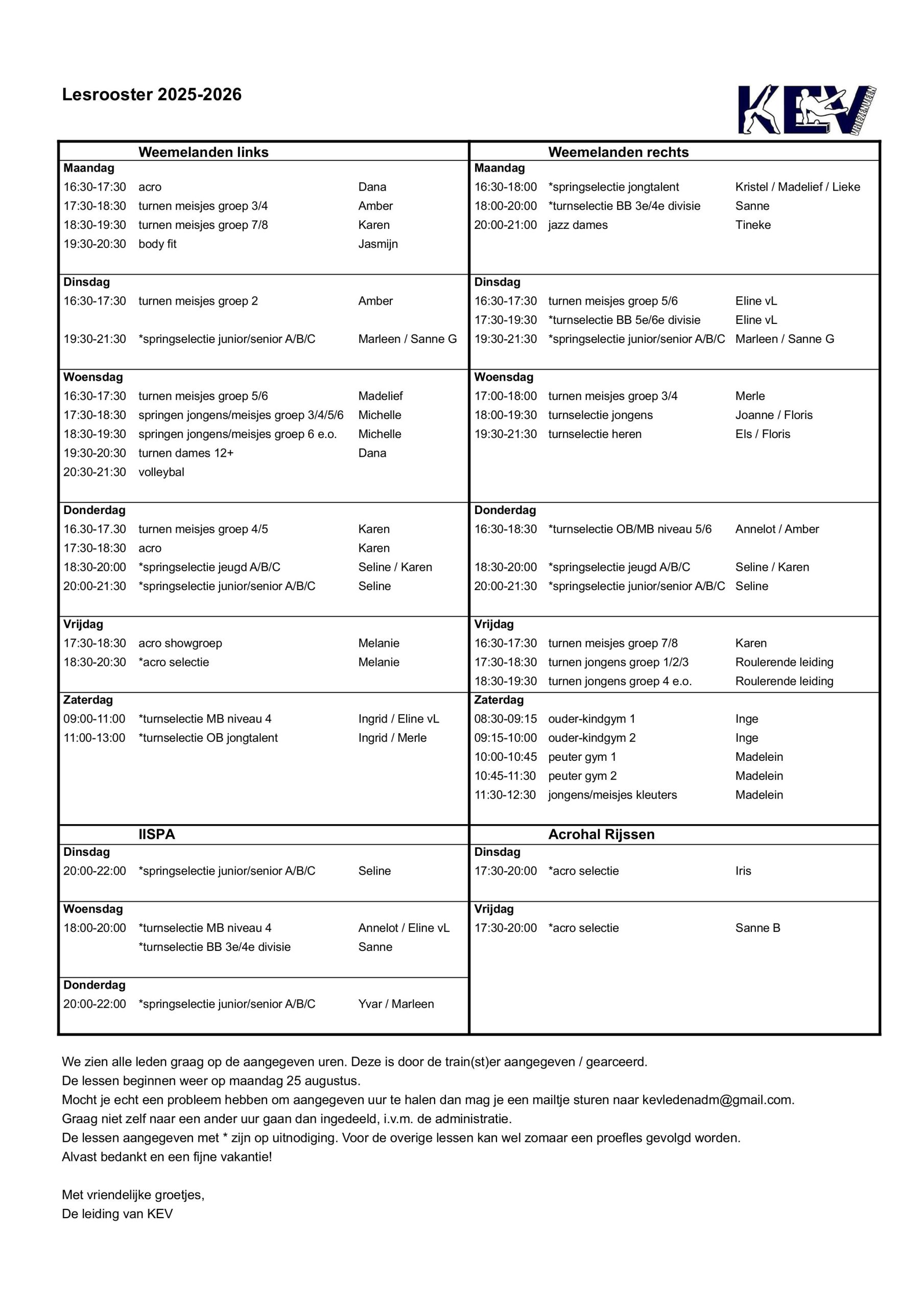 Bij vragen over het lesrooster mag er contact worden opgenomen met: kevledenadm@gmail.com